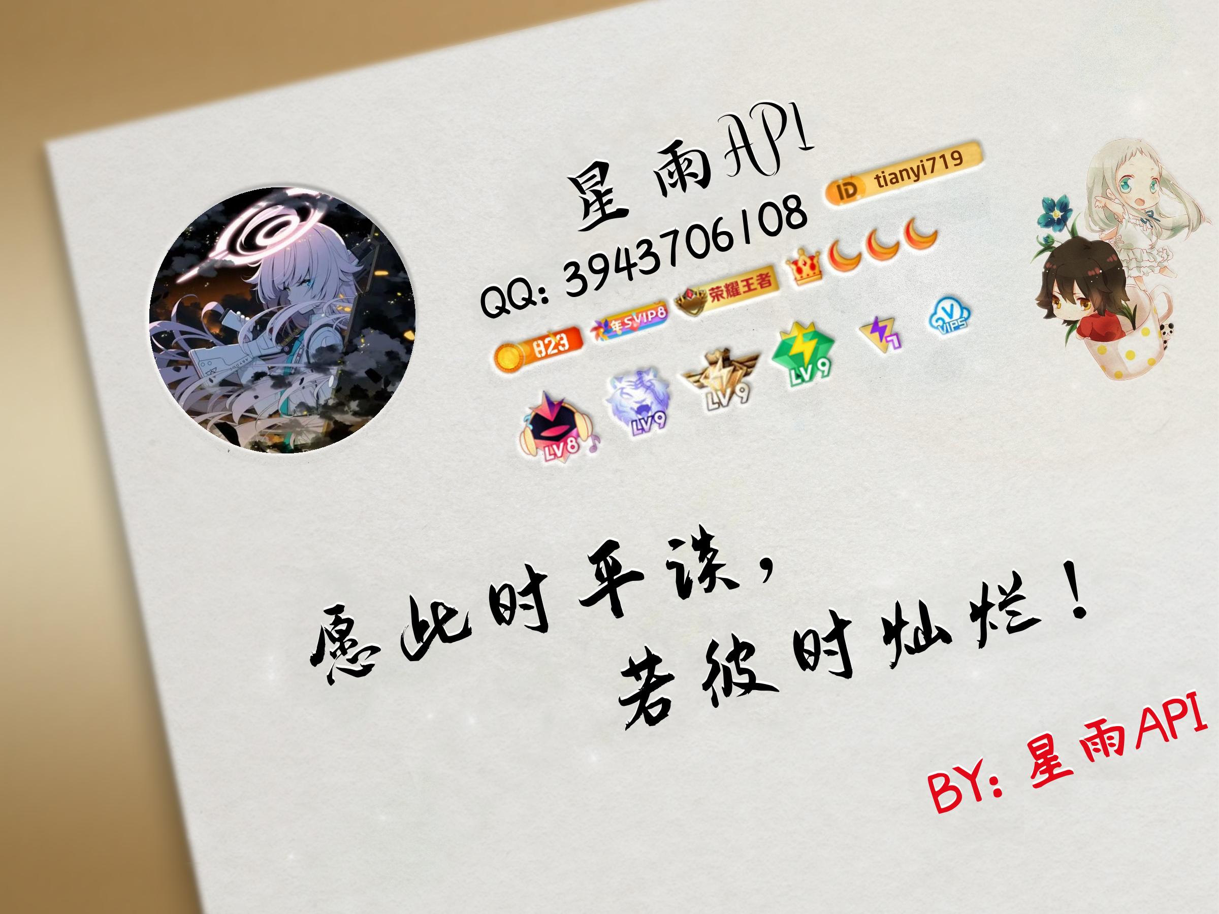 请求示例: https://gh.starrain.fun/api/qqcard.php?uin=3189402257&qid=tianyi719&name=小齐API&wa=愿此时平谈,&was=若彼时灿烂!